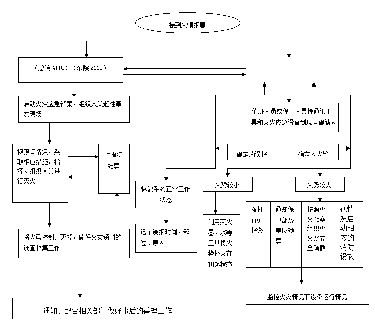 1.通信联络组接到火警后,立即通知医院领导及消防安全责任人和消防安全管理人及各小组成员到达火灾现场;