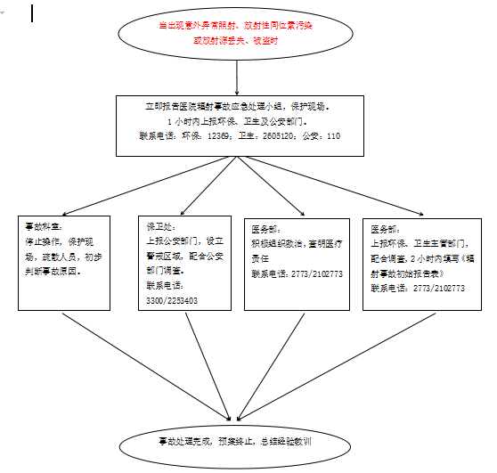 发生或发现辐射事件时,当事人应立即向科室负责人汇报,科室负责人向医院放射事件应急处置小组报告,医院放射事件应急处置小组立即启动本单位的放射事件应急方案,并在2小时内填写[辐射事故初始报告表]向济宁市环保局报告。